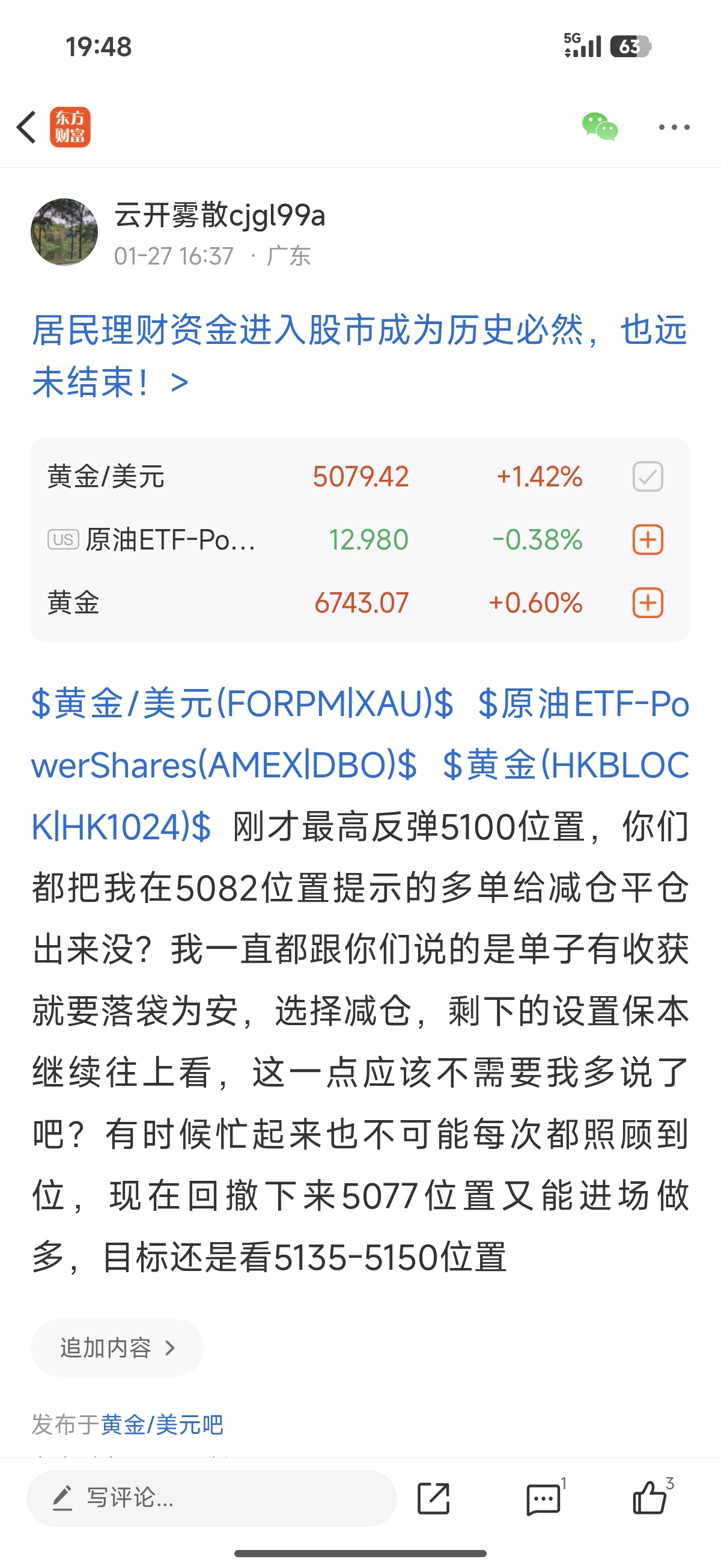 $黄金/美元(FORPM|XAU)$ $黄金(HKBLOCK|HK1024)$ $原油ETF-PowerShares(AMEX|DBO)$ 在5077位置提示进场的多单,现在反弹上来5085位置仍然可以减仓离场,这单又拿下8美金的收获,这已经是今天带你们止盈的第四单了,给到回撤就进场做多,反弹上来就选择落袋为安,这样的操作简直就是爽!