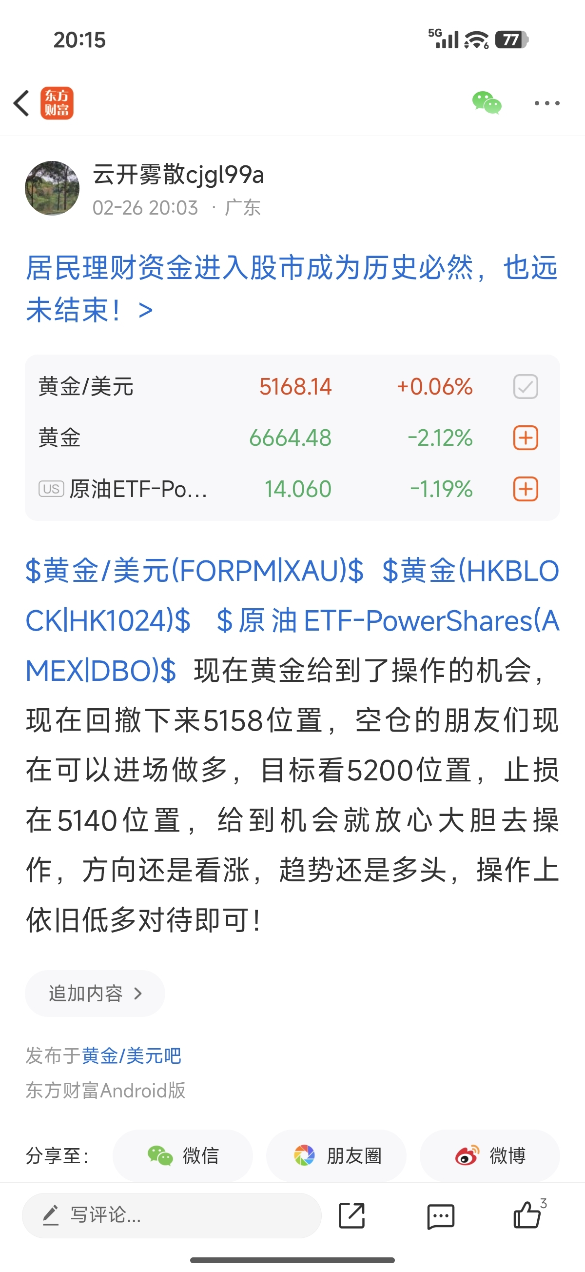 $黄金/美元(FORPM|XAU)$ $黄金(HKBLOCK|HK1024)$ $原油ETF-PowerShares(AMEX|DBO)$ 手上5158多单提示进场后,黄金马上就开始反弹,直接进入浮盈状态,目前已有20个点的浮盈,有跟上这单操作的粉丝可以减仓部分离场,剩余余仓设置保本继续往5200目标位置去看!