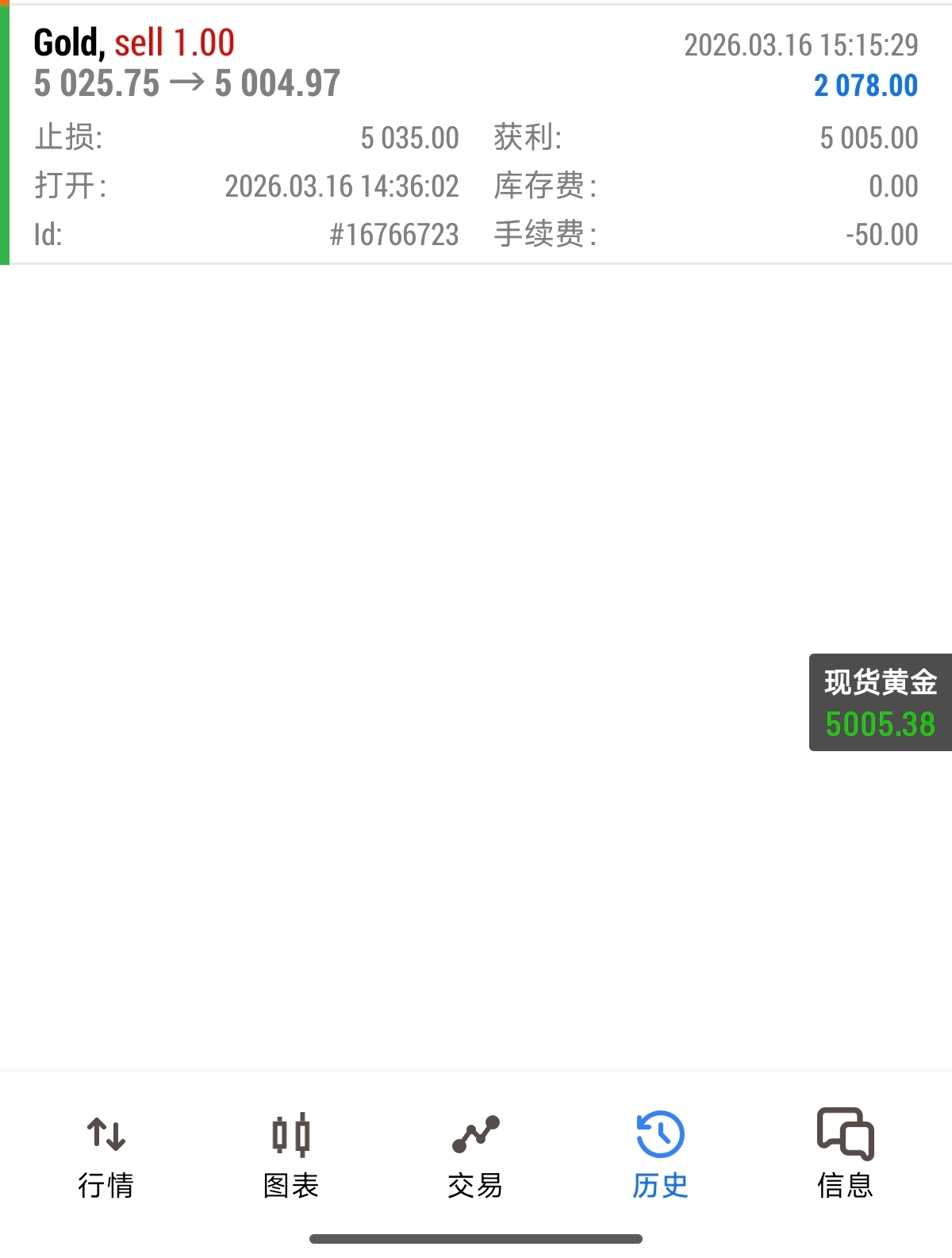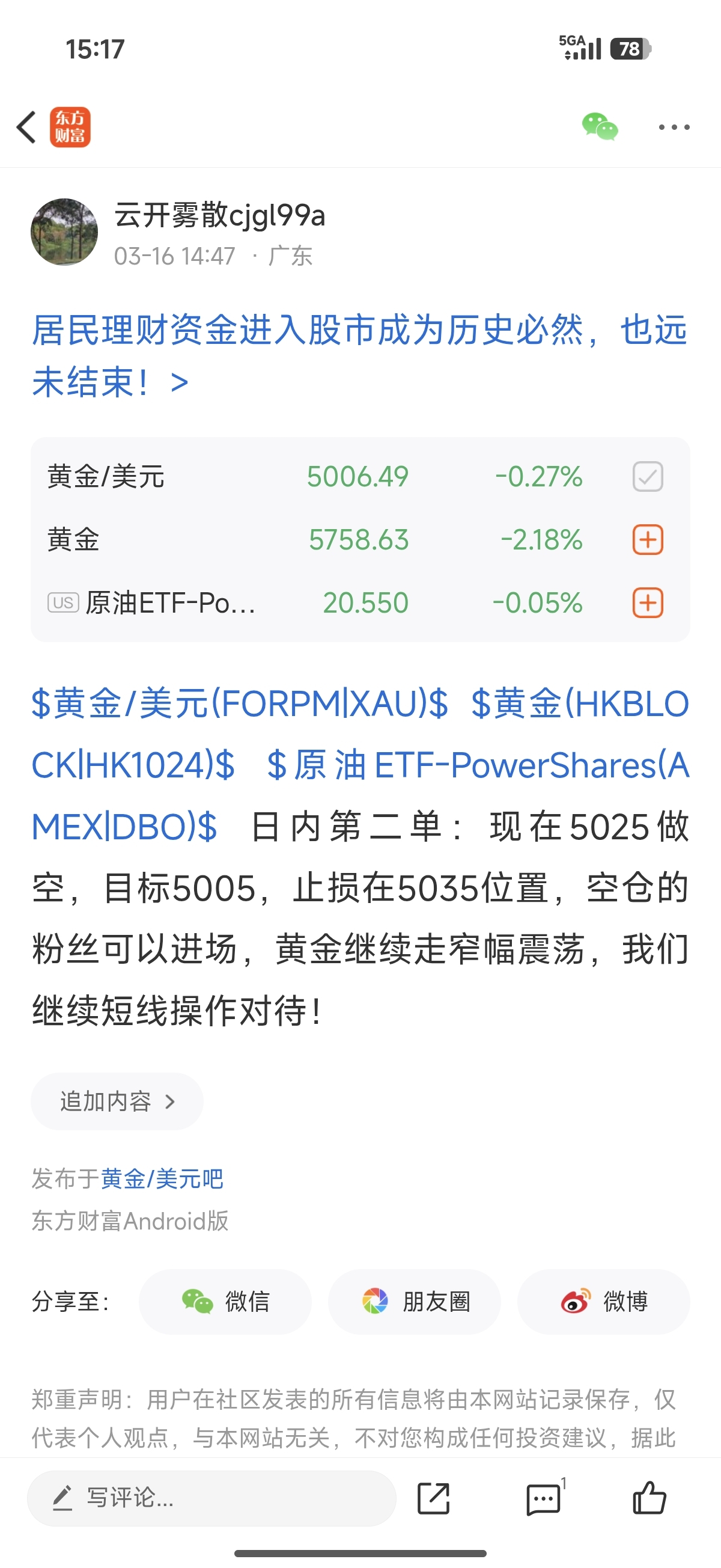 $黄金/美元(FORPM|XAU)$ $原油ETF-PowerShares(AMEX|DBO)$ $黄金(HKBLOCK|HK1024)$ 日内第二单在5025位置做的空单已经在5005目标止盈离场,空单平仓出来之后,现在5003位置反手做多看5025位置,止损在4990位置!