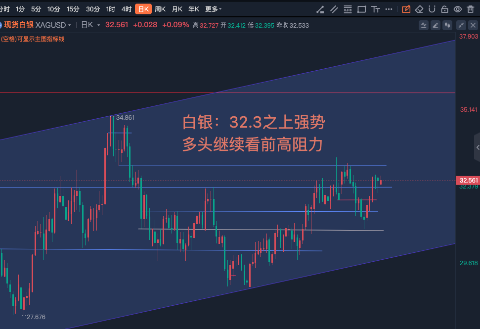 白银:32.3之上强势多头继续看前高阻力沪银:不如国际白银强7870之上还是多