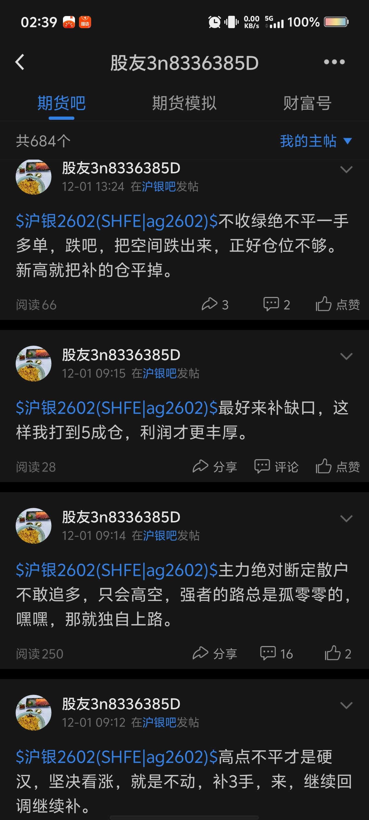$沪银2602(SHFE|ag2602)$ 12月1日,坚定看多,从12814做多到15777,反手空,止损100点,休整一天。然后逢低多,不敢再长线持有,行情已经超出预期很远,不断刷新想象的极限,那天看到个帖子说得对,最大的利润是等出来的,不是开平仓做出来的,开平仓只是为了验证自己的想法,想法对了就满足了,就止盈了,想法错了,就止损了。记录一下,面对极端行情,自己的心理依旧不够强大。谨记谨记。