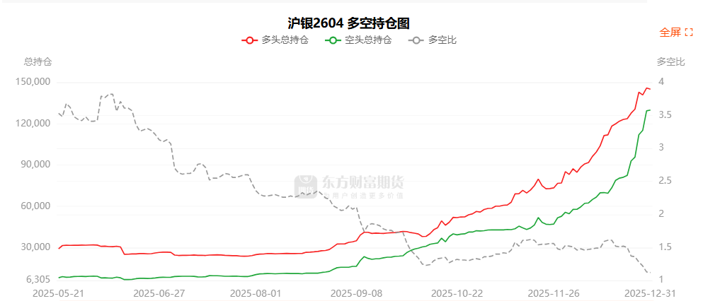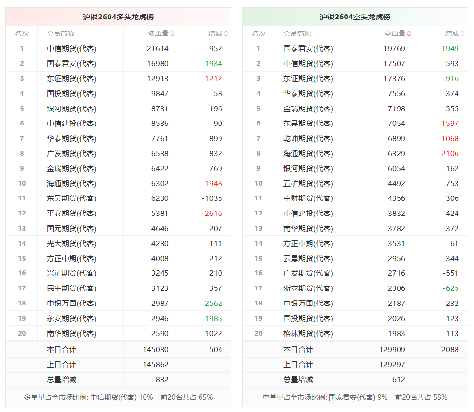 总体而言,沪银2604合约今日减仓下行,多空持仓排名前20席中,多方呈退场态势,空方呈进场态势。