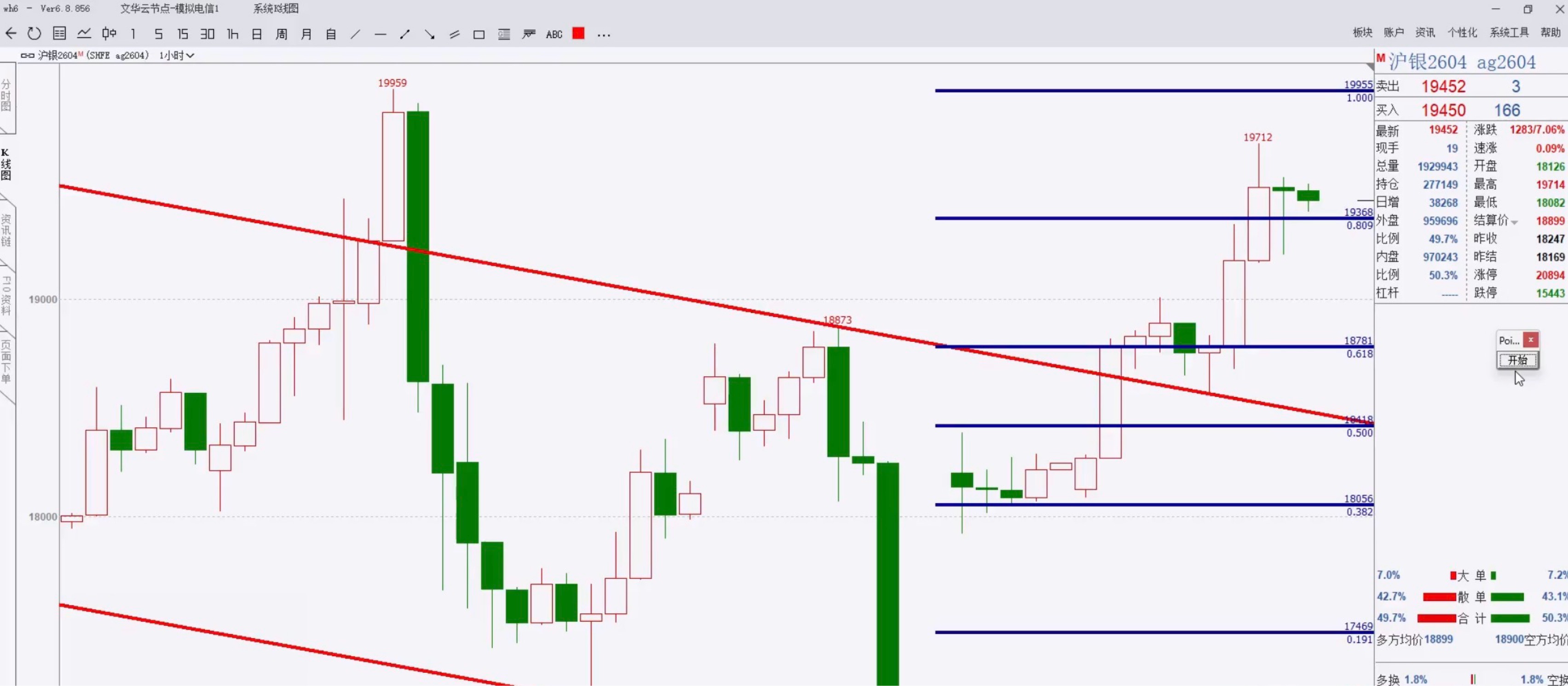 今天又是踏空的一天,虽然看好白银的后续上涨,但对于短线走势反弹到0.618压力位的疑虑,造成不敢进场加多。临收盘前做了几手多单,也被急速下行打了止损。所以此时不能重仓,波动太大了。
