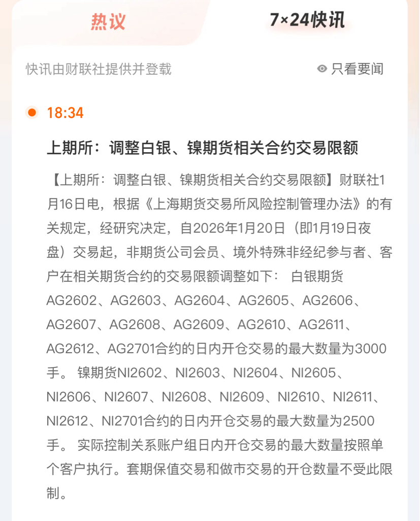 注意注意!上期所再次将白银日内开仓交易数调整3000手。此前1月8日限制7000