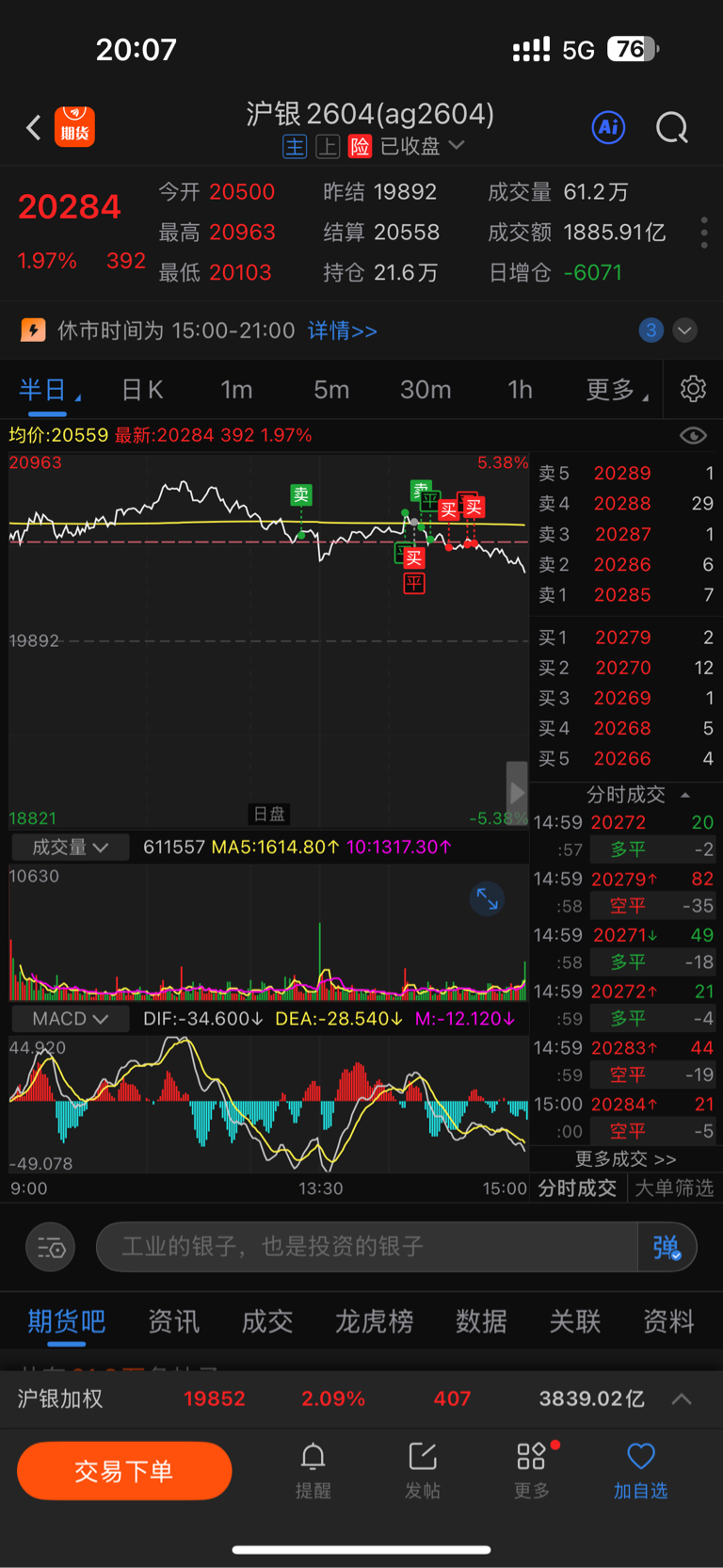 $沪银主连(SHFE|agm)$ 新手问问老鸟,为啥我下午2点买了多,收盘的时候亏两千多。这会结算完反到赚了一千多