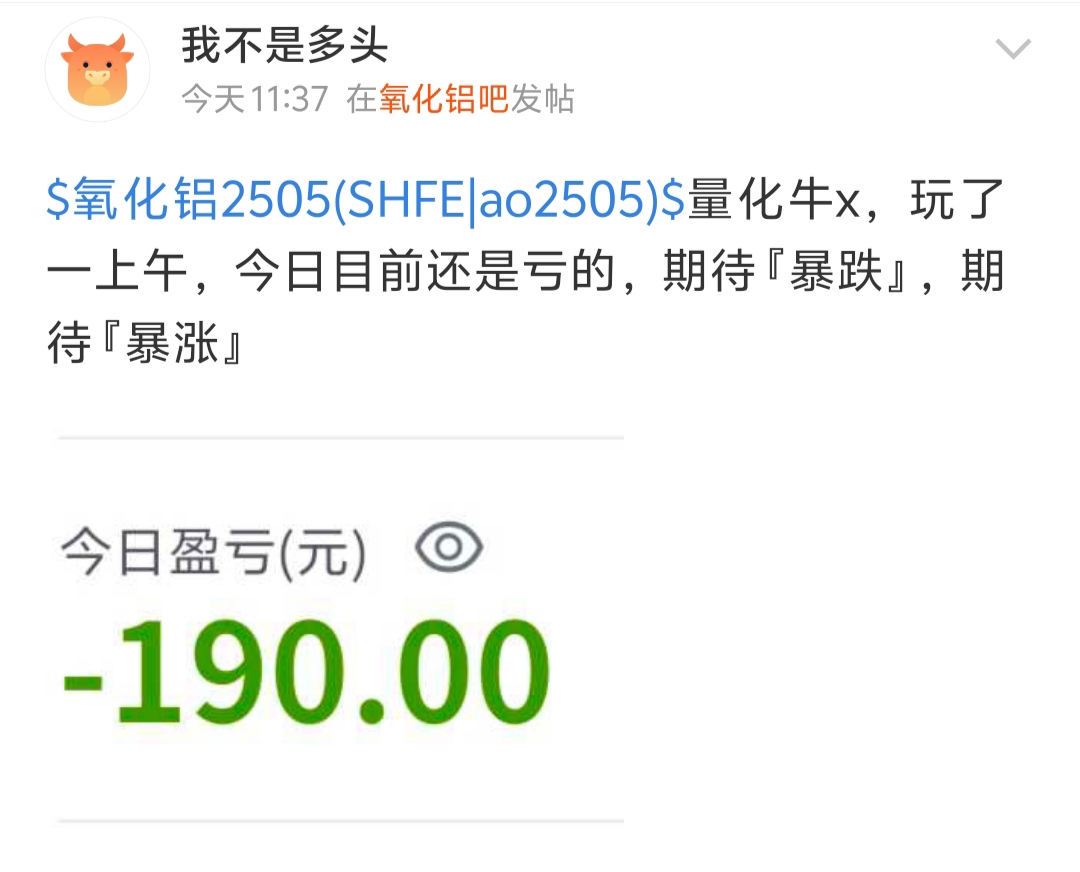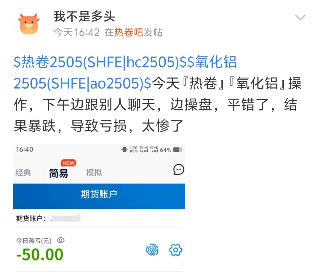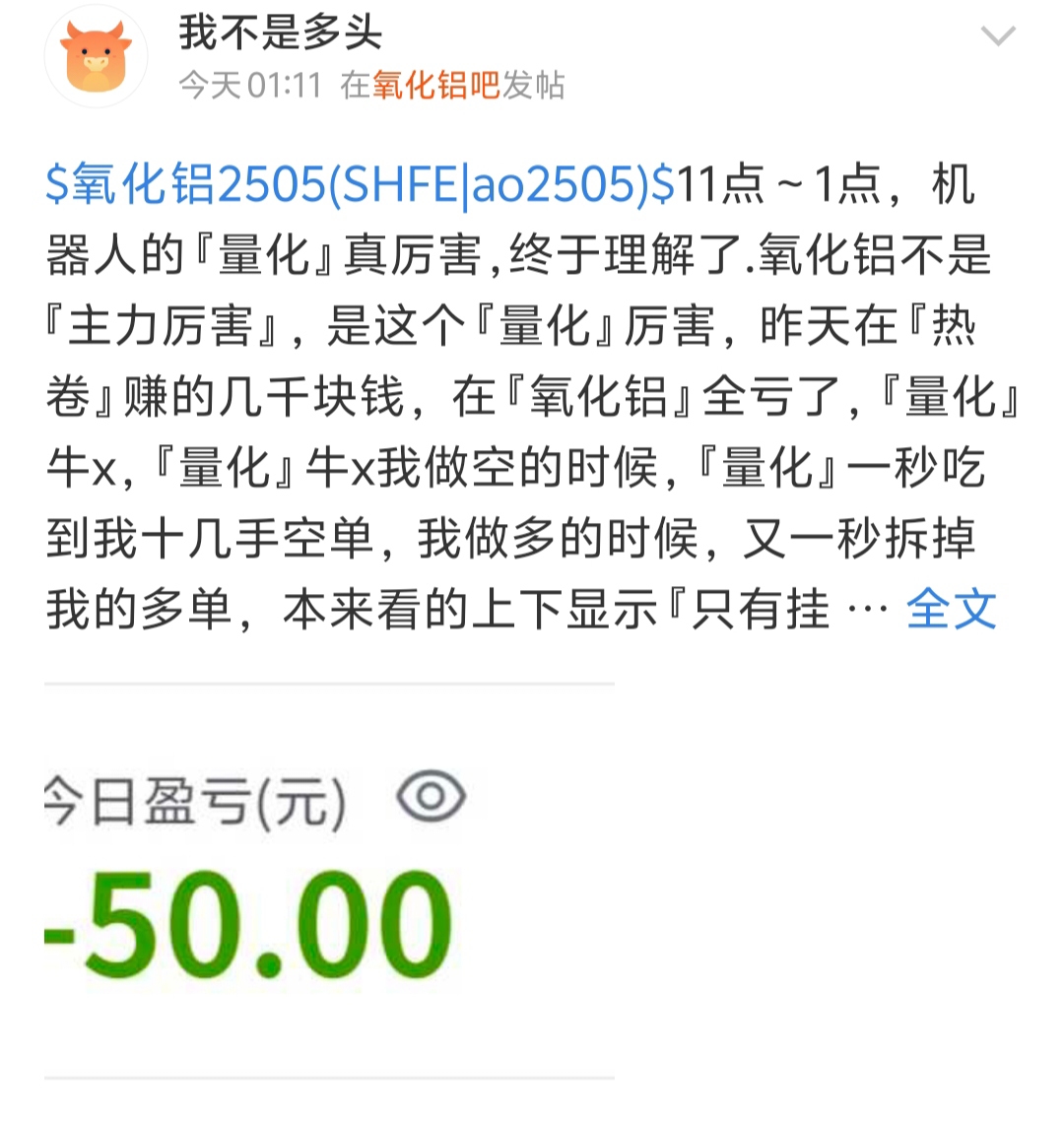 $氧化铝2505(SHFE|ao2505)$ $热卷2505(SHFE|hc2505)$ 下午跟人喝茶吹牛,别人说你最近在炒股么?我说我在做期货,他说:你赚钱了么?我说今天又亏了,太难了,对不起老婆,对不起家人,一天到晚做期货,还是亏的……