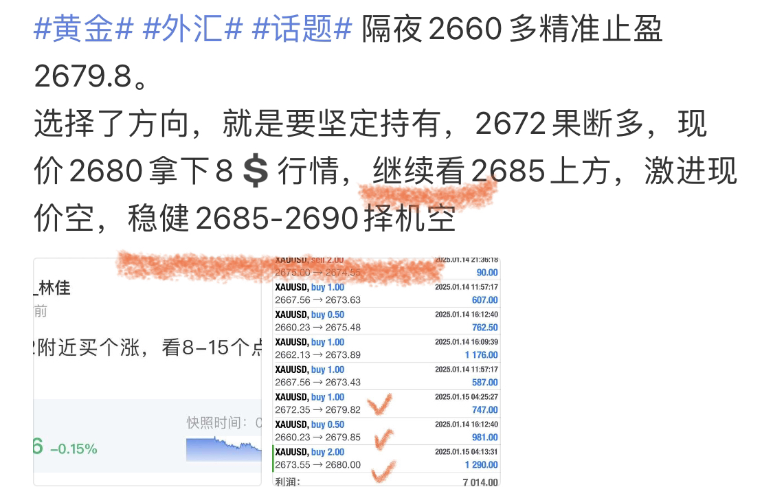 市场没有绝对,落袋了才是自己的。2672多完美止盈2685吃下13个点,2685