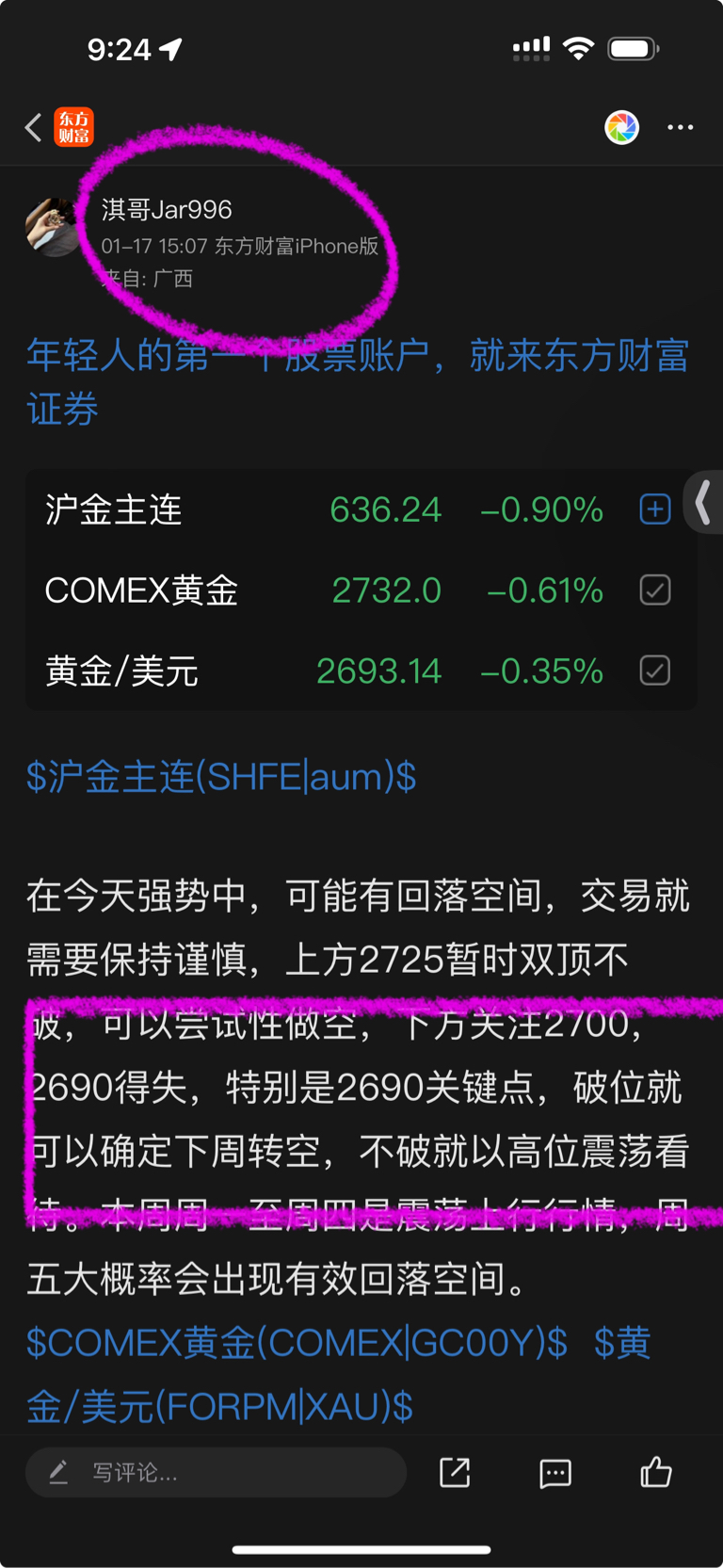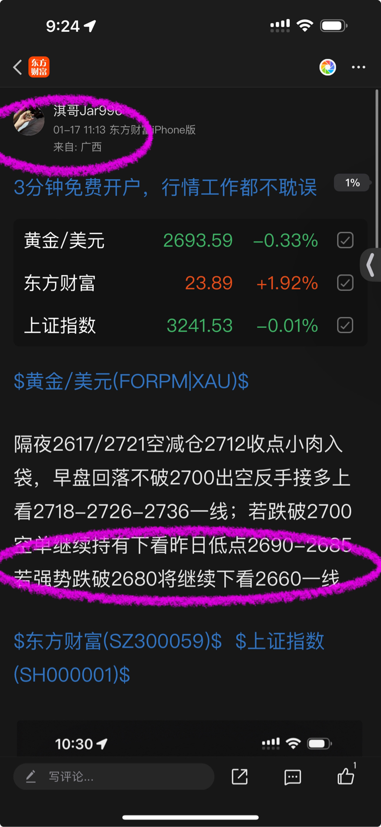 上周四/周五我们就有提示到2721/17破位2700下看2690-2685一线我们的空单稳稳拿下30美金行情打底!