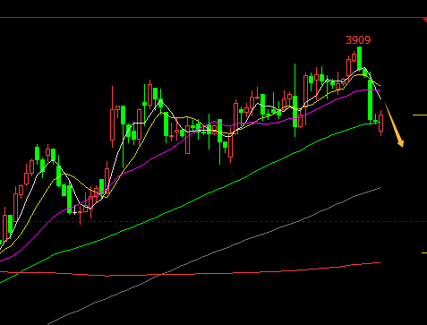 4小时图上均线拐头,顶背离形态,依托上方均线压力3800空到下面的3700即可,带小止损
