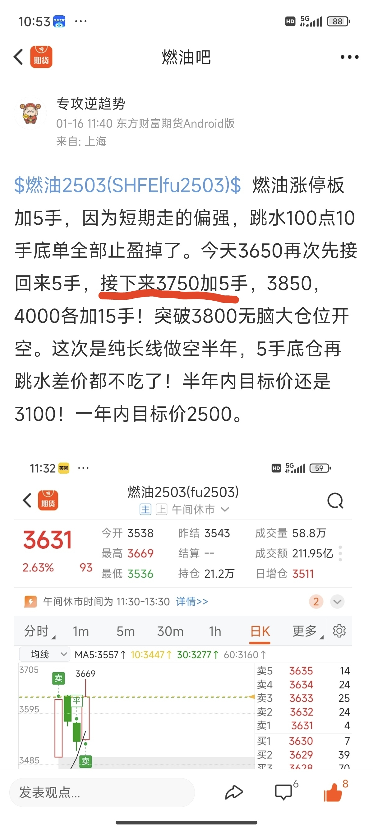 $燃油2503(SHFE|fu2503)$ 还是拿着3650的5手长线空单,下周3750加5手,3850加15手,预计最多3850见顶,到不了4000。短期第一目标价3500,中线目标价3000!