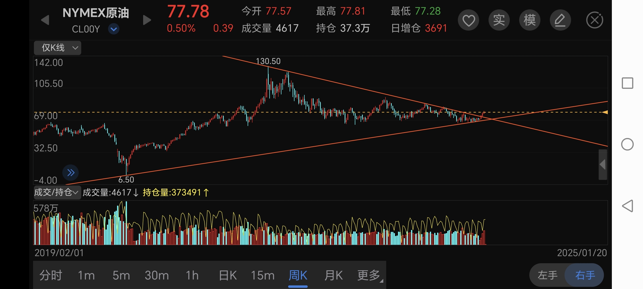 $燃油2503(SHFE|fu2503)$ 再画一个外盘原油周线图。信则灵,不信则不灵。好好体会这句话