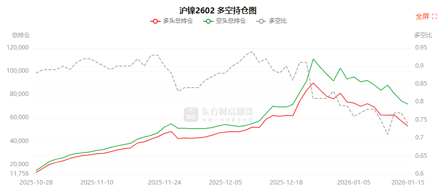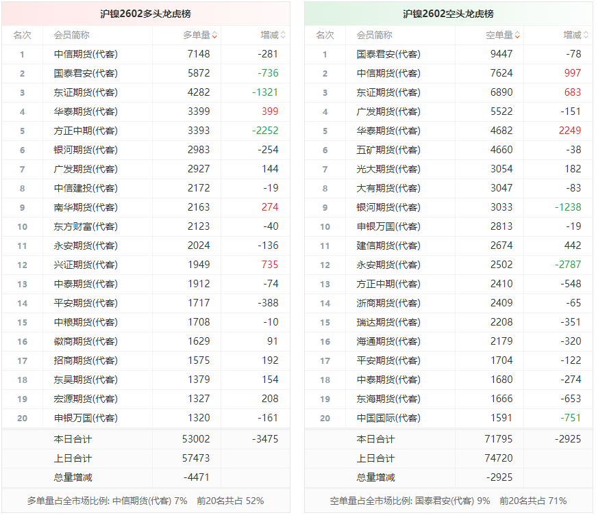 总体而言,沪镍2602合约今日减仓上行,多空持仓排名前20席中,多空双方均呈退场态势,多头退场意愿强于空头。