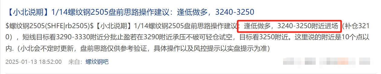 $螺纹钢2505(SHFE|rb2505)$ 螺纹钢多单兑现50点,1.14盘前给的思路是3240附近进场多单,今天盘中最高触及3293。(小北会不定时更新,盘前思路仅供参考验证,具体操作以及风控提示以实盘提示为准)