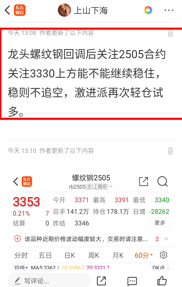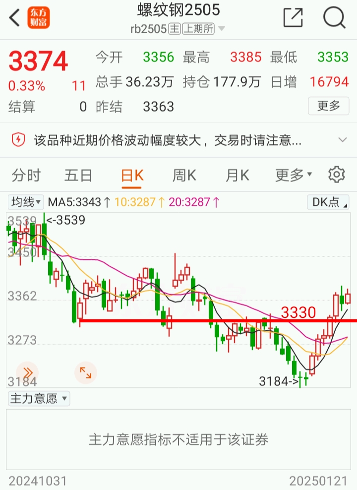 龙头螺纹钢今天回调后在今天下午和夜盘继续稳于3330关键位之上。