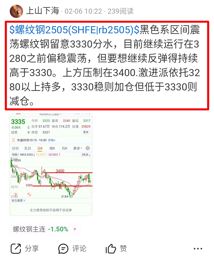 $螺纹钢2505(SHFE|rb2505)$ 黑色系继续增仓消化美国对全球进口的钢材加关税的行业负面影响,龙头螺纹钢在3330分水以下上午最低刚上试探了上一波短波多进场位之上3280。下午继续留意该位若没继续下破则在3280以上空单不宜追空防向上反复,毕竟3280是前面多头的成本区在该位有抵抗。