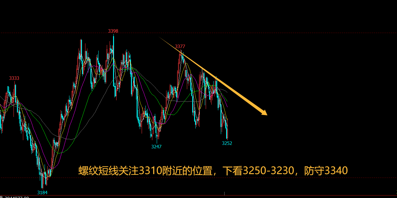 $螺纹钢2505(SHFE|rb2505)$ 螺纹05合约:今天整体一片绿,没有最低只有更低,螺纹继续低破前一波低点支撑并在创新低,趋势整体偏弱,短线依旧保持高空思路,短线关注3310附近的位置,下看3250-3230,防守3340(投资建议 仅供参考 具体以实盘操作为主)