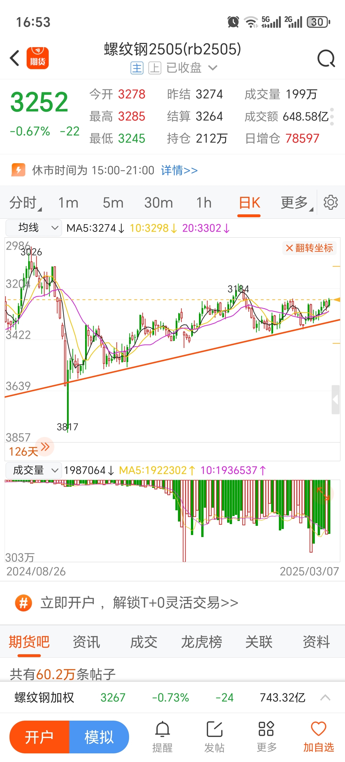 $螺纹钢2505(SHFE|rb2505)$ 上升趋势非常良好。哈哈