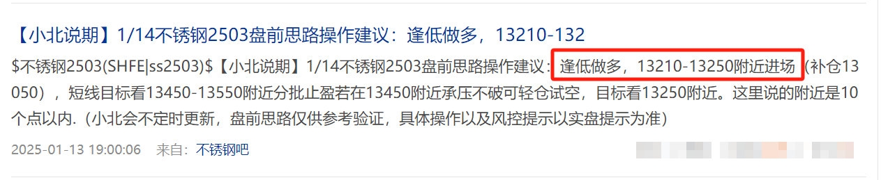 $不锈钢2503(SHFE|ss2503)$ 不锈钢多单兑现120点,1.14盘前给的思路是13210附近进场多单,今天盘中最高触及13340。(小北会不定时更新,盘前思路仅供参考验证,具体操作以及风控提示以实盘提示为准)