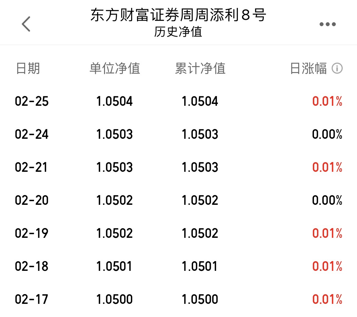 之前每周只有3天有收益。我和理财师抱怨,货币产品应该每天计算收益!理财师说。是对方披露规则原因。东财资管和天天一个公司的,沟通应该比较方便。所以我让他去劝劝东财,我们持有人就是想看到每天的收益。
