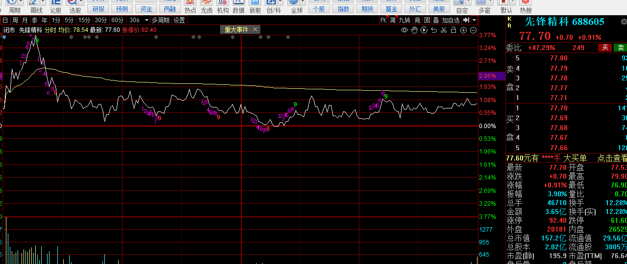 今天收涨1个点,走势比我预期要好。早盘随科技股普跌曾一度回落,但尾盘有做了护盘。从板块上看,今天机器人依然活跃,五洲新春更是展现出类似上海贝岭前期的走势特征。在此背景下,先锋精科作为半导体设备精密零部件赛道的头部选手,走出独立行情实属不易。未来随着硬科技方向的补涨预期发酵,目前这个点位继续持有,等待板块性机会。