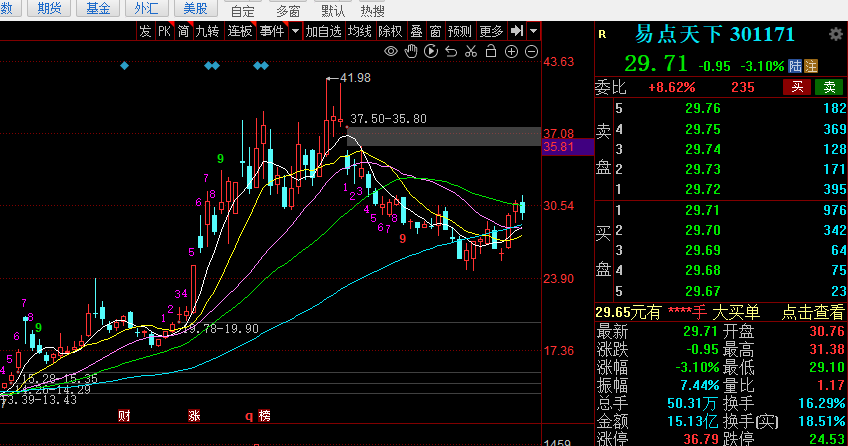 今天跌幅3个点,盘面较为疲软。从早盘表现看,一度有护盘意图,但随着市场风格向消费切换,AI概念股普遍承压。易点天下作为AI应用端的核心标的,前期积累了不少获利。今天中百集团、来伊份等消费股走强,显示增量正加速向消费赛道转移。不过从中长期来看,公司获得了紫金资金重点布局,在数字贸易和AI营销领域的成长逻辑并未改变。等市场消化完获利盘压力,有望重新走强。