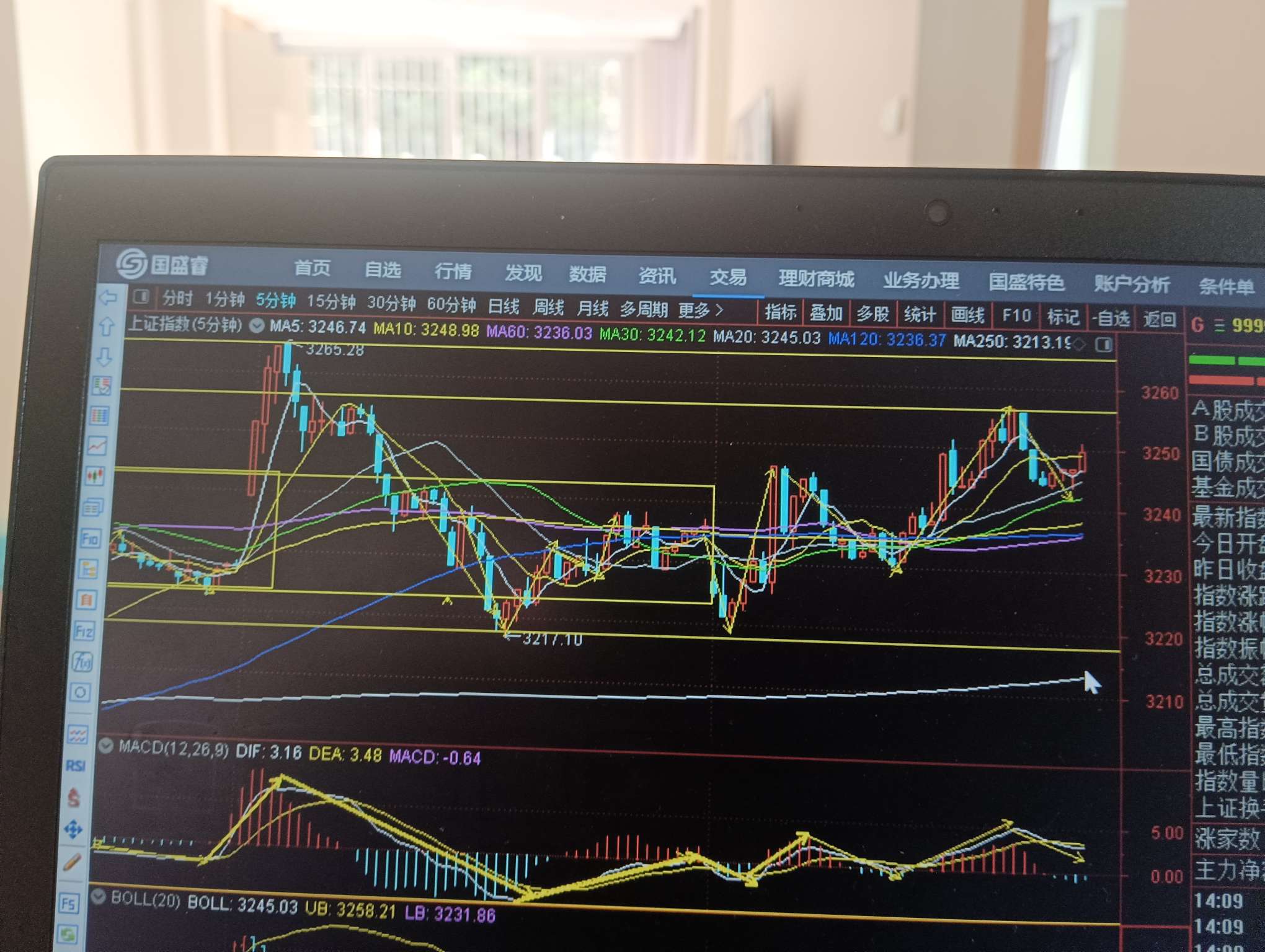 上证:14点10分:5分钟K图如上示:沿M60钱上移动5浪态势,当前正行4浪中,