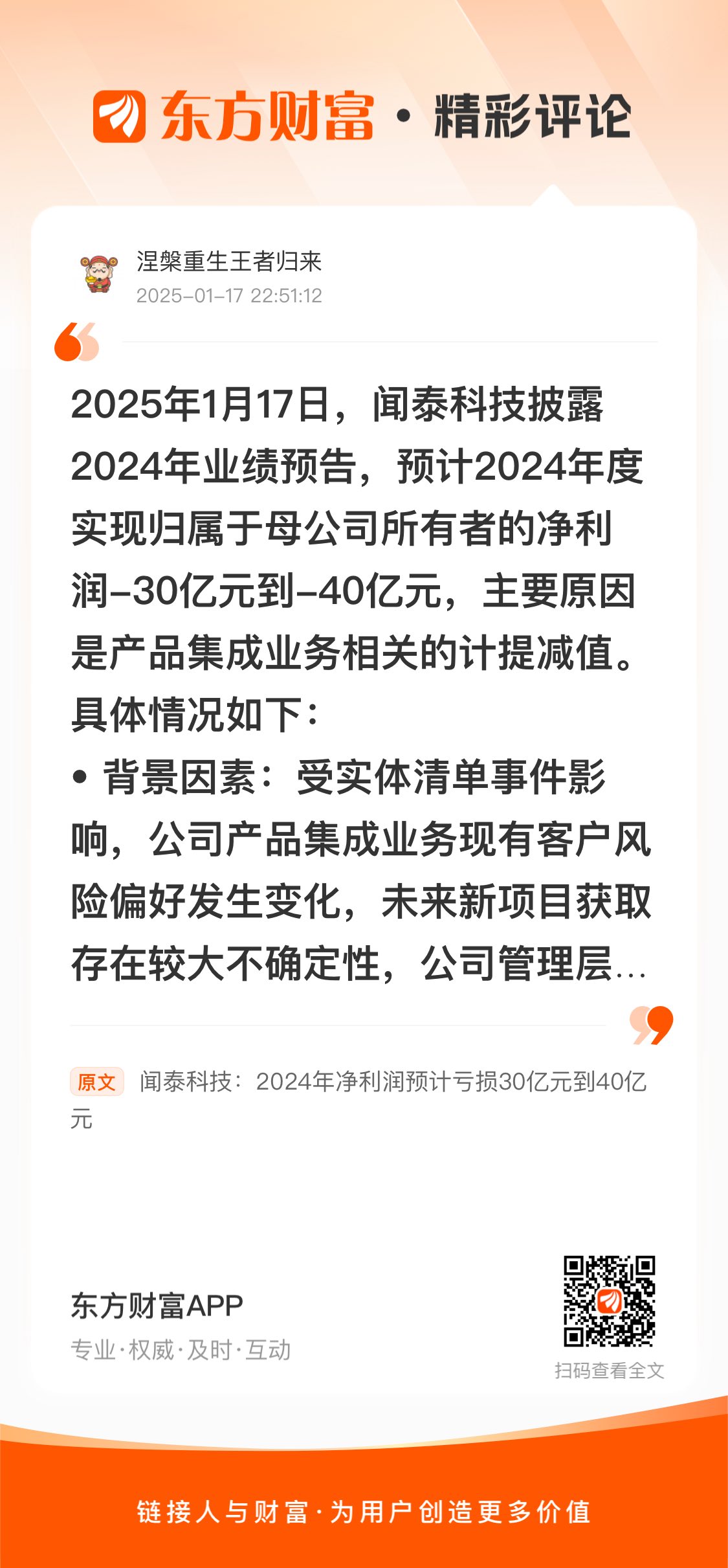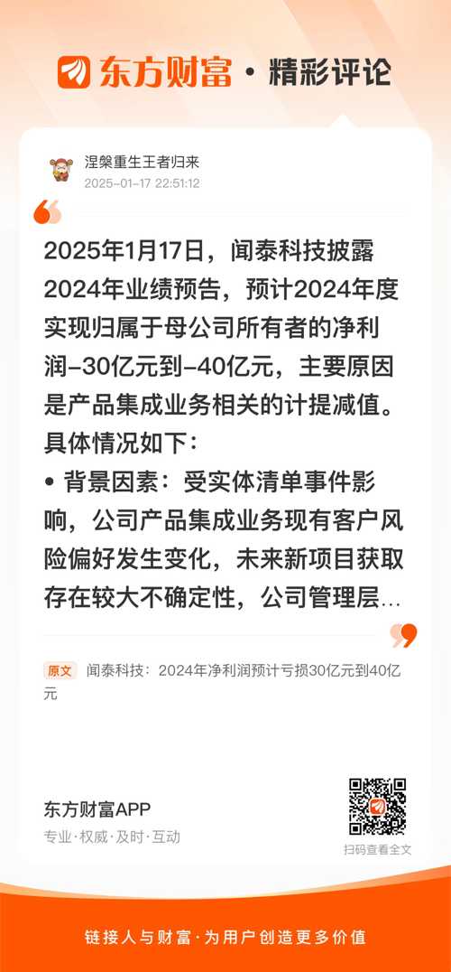 //@涅槃重生王者归来 : 2025年1月17日,闻泰科技披露2024年业绩预告,预计2024年度实现归属于母公司所有者的净利润-30亿元到-40亿元,主要原因是产品集成业务相关的计提减值。具体情况如下: