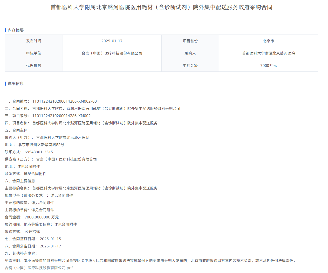 【合富中国】中标项目【首都医科大学附属北京潞河医院医用耗材(含诊断试剂)院外集中配送服务政府采购合同】,中标金额为【7000.00】万元,收入营业额占比为【6.41%】。
