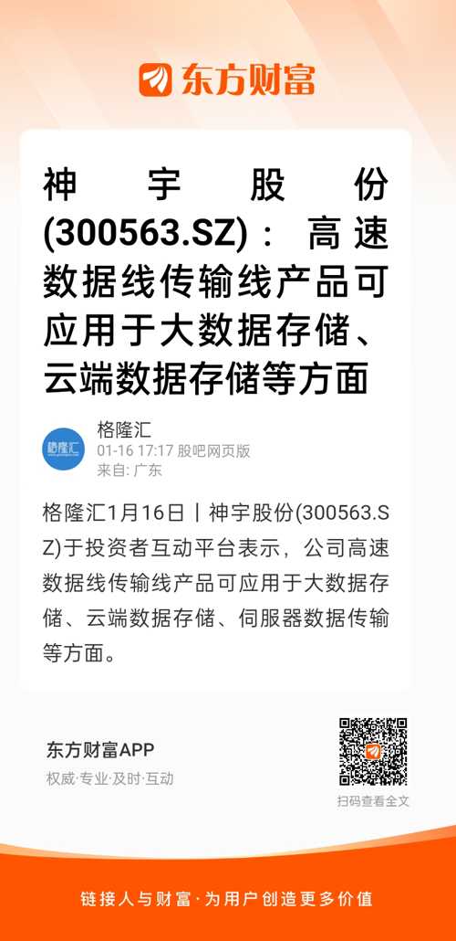 格隆汇1月16日丨神宇股份(300563.SZ)于投资者互动平台表示,公司高速数据线传输线产品可应用于大数据存储、云端数据存储、伺服器数据传输等方面。