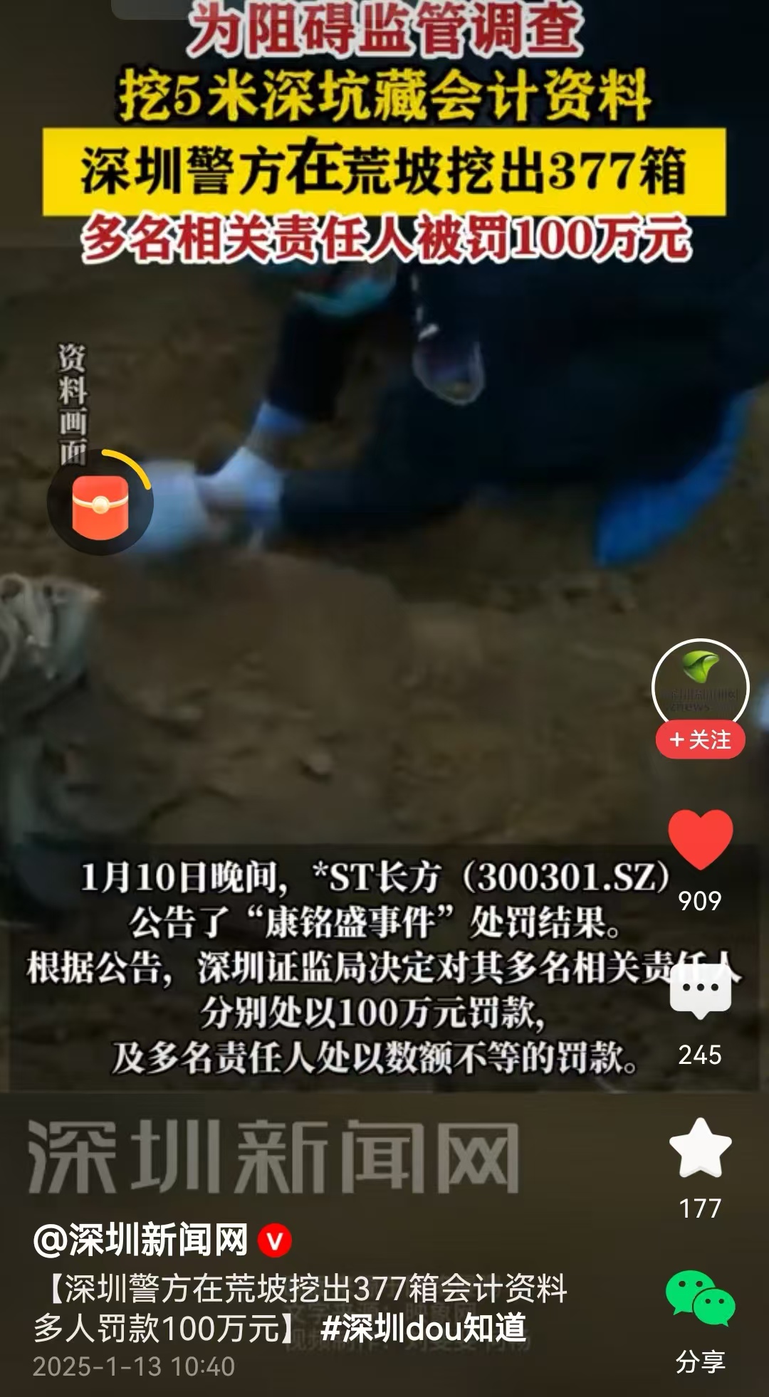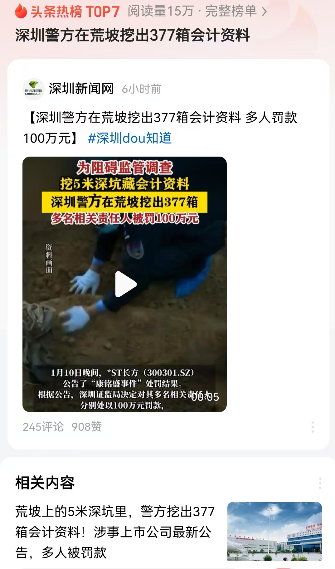 又一次创造了我国证券史上的一个新纪录,上市公司旗下最主要子公司的会计账簿,一共377箱。都被偷偷埋在了长9米、深5米,宽5米5米的深坑内,此次被深圳警方远赴江西,在荒坡上被挖出。不但如此,他们还涉嫌拒绝、阻碍证券监督部门派出人员检查违法行为。
