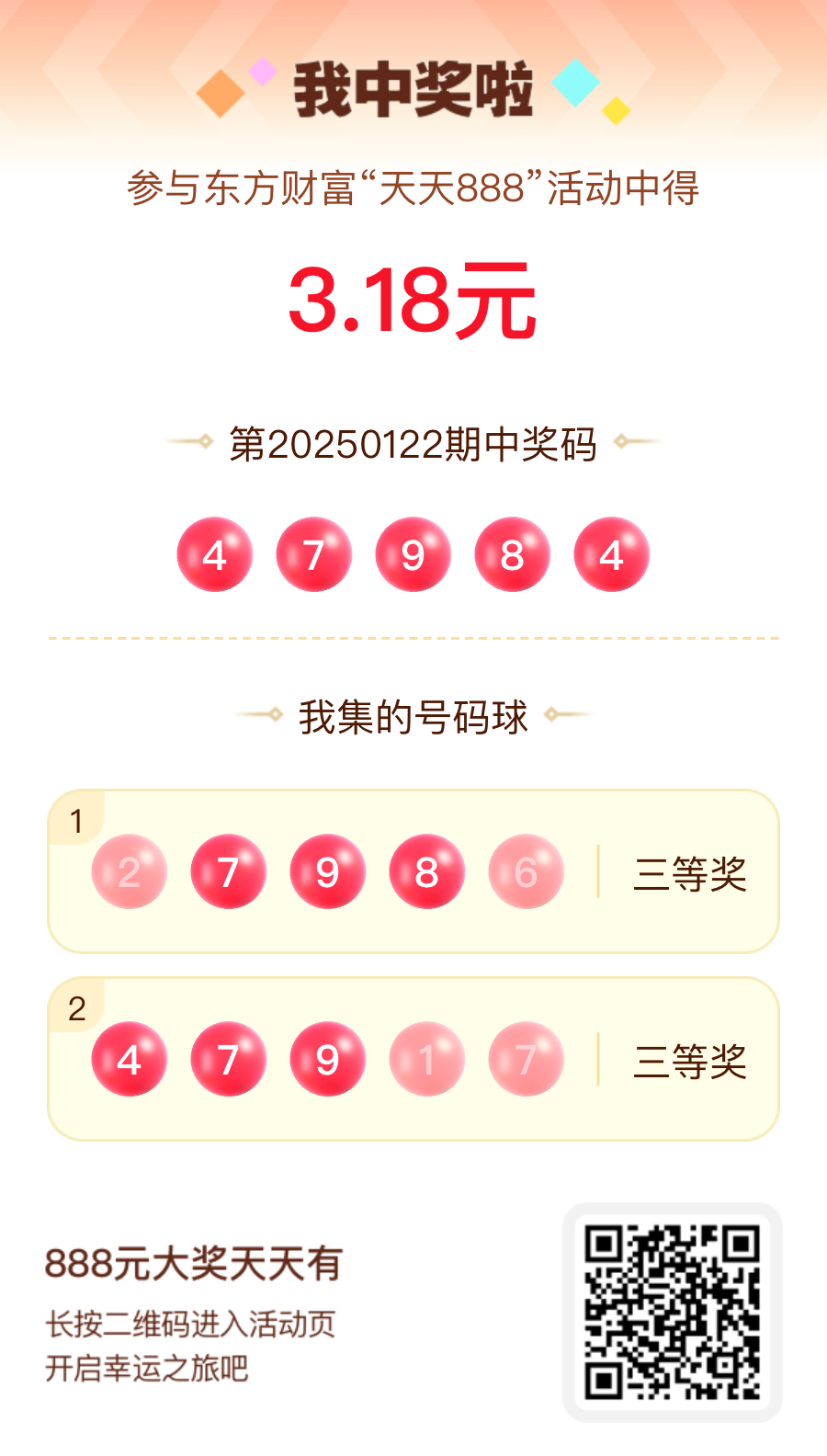 第20250122期天天888活动共1549人中奖,名单如下,请中奖用户在今日15:10前前往活动页面点击【立即领奖】按钮领奖,逾期奖励失效。