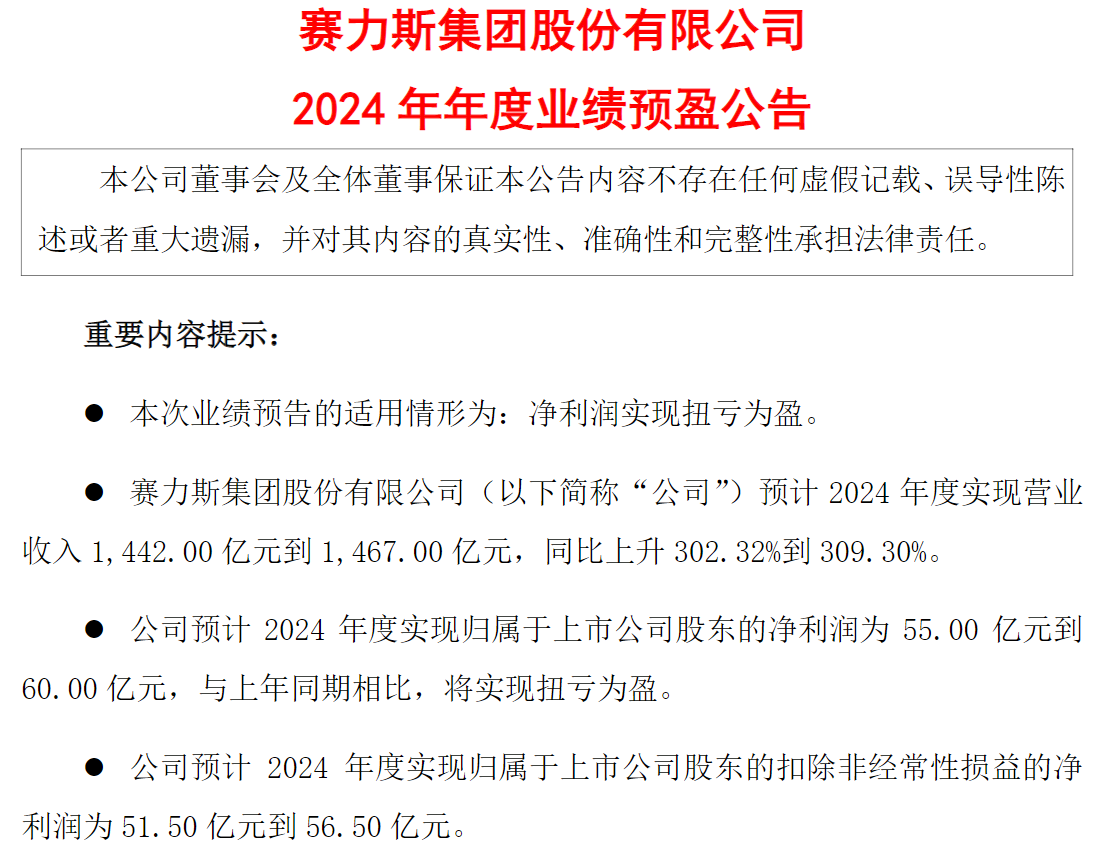1月21日晚间,赛力斯公告,预计2024年度实现营业收入1442亿元到1467亿元,同比上升302.32%到309.30%。预计实现归母净利润55亿元到60亿元,同比扭亏为盈。