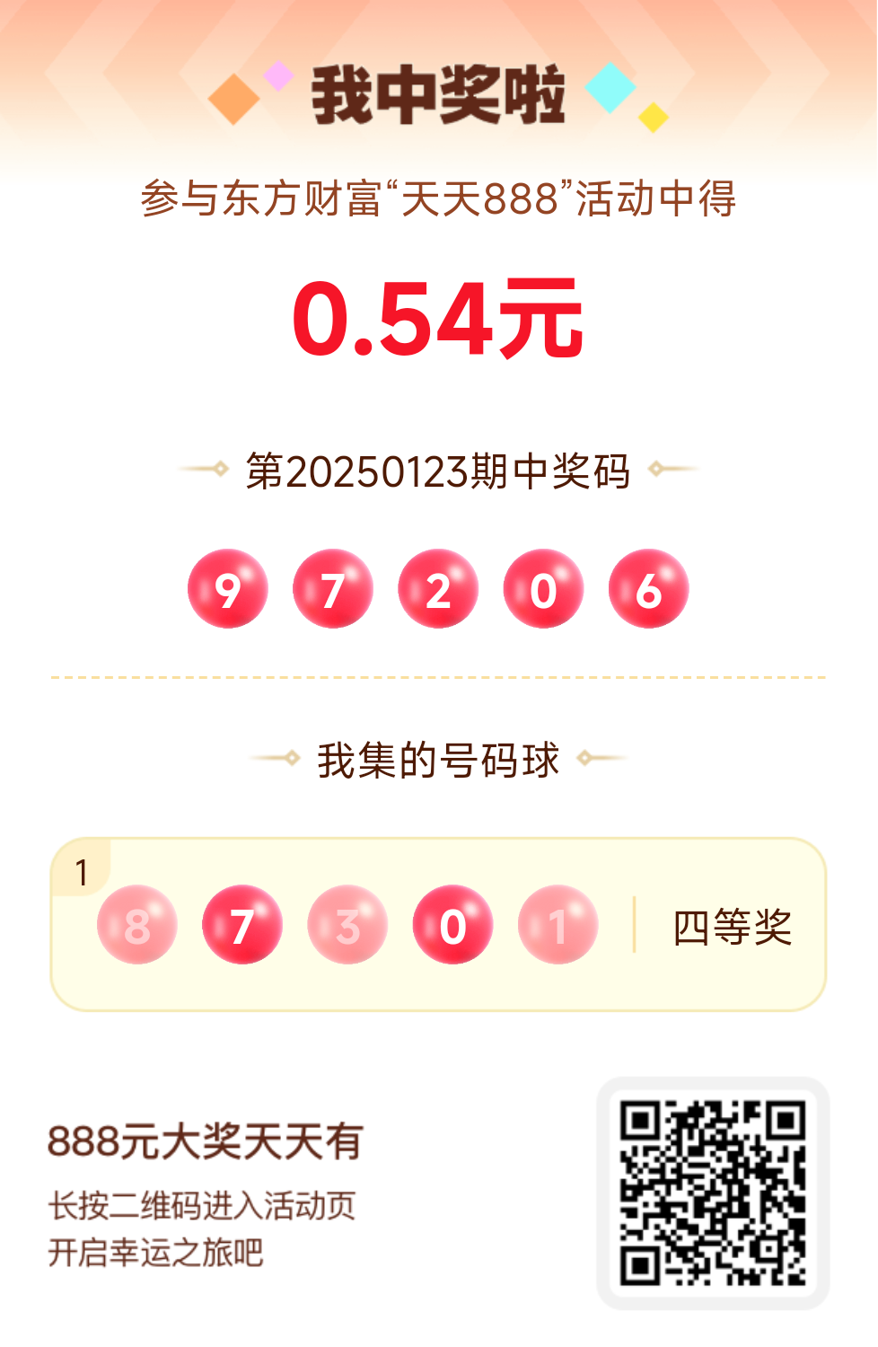 好运来敲门!我在东方财富“天天888”抽奖活动中抽中0.54元红包!快来参与,下一个幸运星可能就是你!