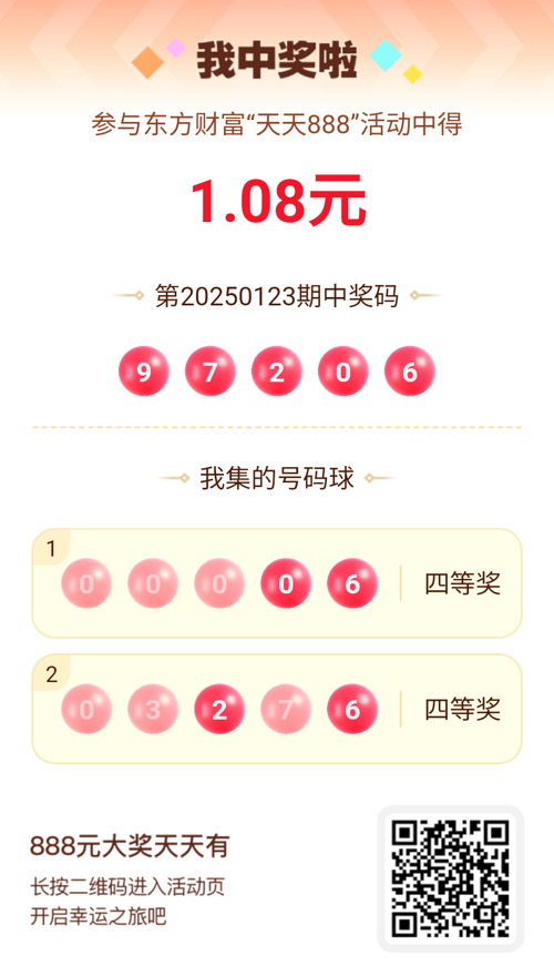 好运来敲门!我在东方财富“天天888”抽奖活动中抽中1.08元红包!快来参与,下一个幸运星可能就是你!