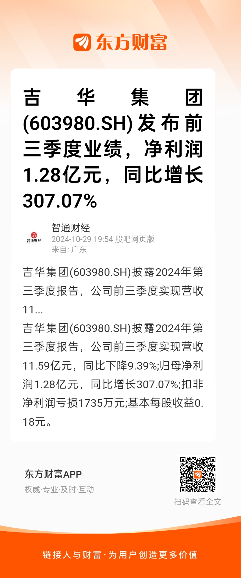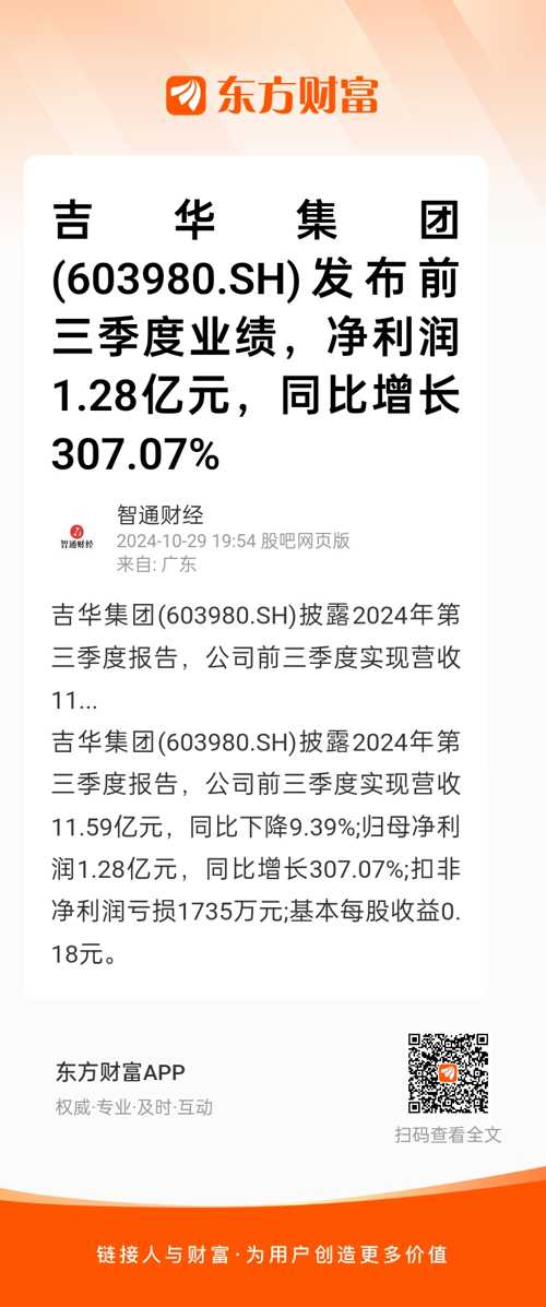 吉华集团(603980.SH)披露2024年第三季度报告,公司前三季度实现营收11...