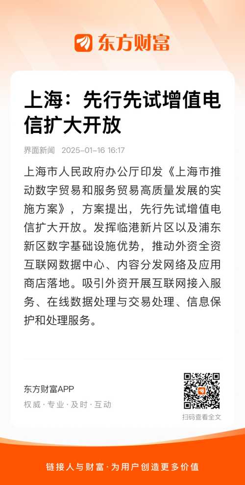上海市人民政府办公厅印发《上海市推动数字贸易和服务贸易高质量发展的实施方案》,方案提出,先行先试增值电信扩大开放。发挥临港新片区以及浦东新区数字基础设施优势,推动外资全资互联网数据中心、内容分发网络及应用商店落地。吸引外资开展互联网接入服务、在线数据处理与交易处理、信息保护和处理服务。