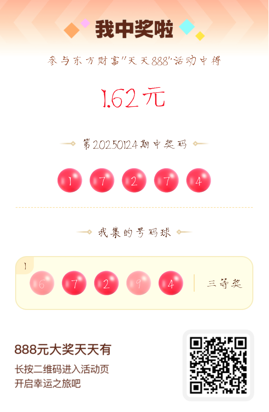 好运来敲门!我在东方财富“天天888”抽奖活动中抽中1.62元红包!快来参与,下一个幸运星可能就是你!