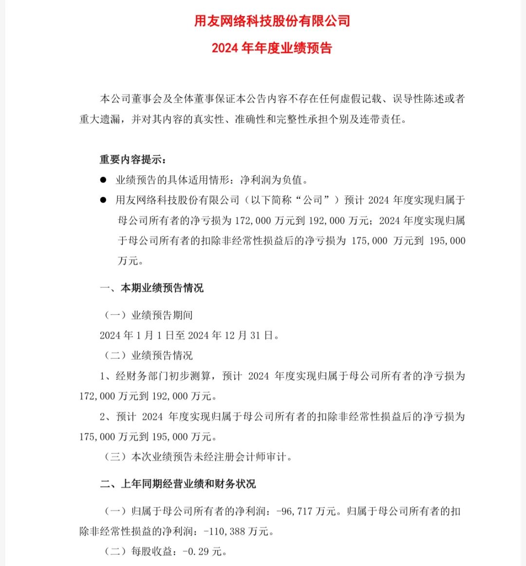 1月23日晚间,用友网络发布公告称,2024年公司预计实现归属于母公司所有者的净利润为亏损17.2亿元至19.2亿元,上年同期归母净利润为亏损9.67亿元。