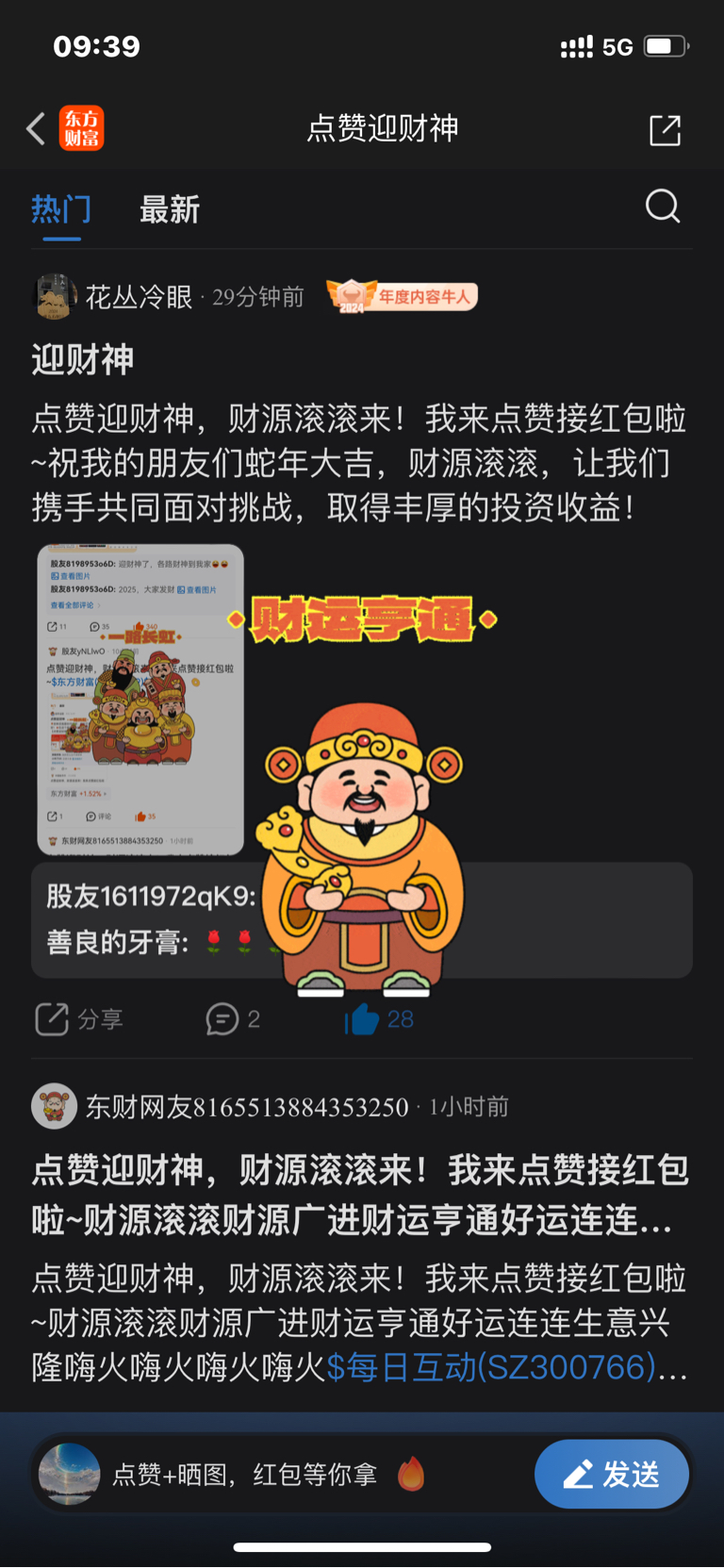 点赞迎财神,财源滚滚来!我来点赞接红包啦~祝我的朋友们蛇年大吉,财源滚滚,让我们携手共同面对挑战,取得丰厚的投资收益!