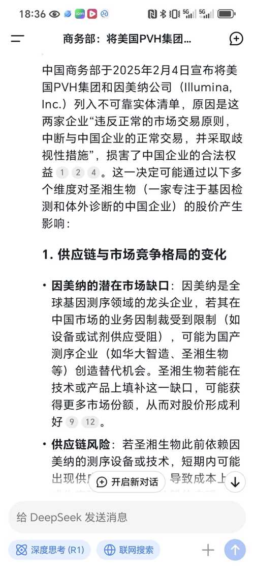 - 减少外部竞争压力:因美纳公司是全球基因测序和芯片技术的领导者,在基因检测技术和设备领域占据重要市场份额,其产品广泛应用于生命科学等多个领域,国内多家顶尖医疗机构、科研院所及生物医药企业均依赖其设备和技术。将因美纳公司列入不可靠实体清单,其在中国市场的业务发展将受到限制,这在一定程度上会减少圣湘生物在基因检测等相关领域的外部竞争压力,为圣湘生物提供了更广阔的市场发展空间。