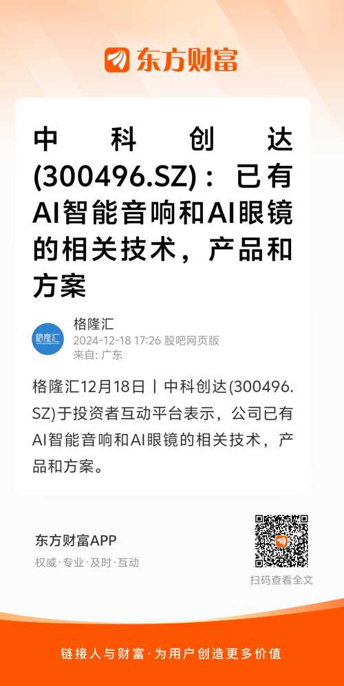 格隆汇12月18日丨中科创达(300496.SZ)于投资者互动平台表示,公司已有AI智能音响和AI眼镜的相关技术,产品和方案。