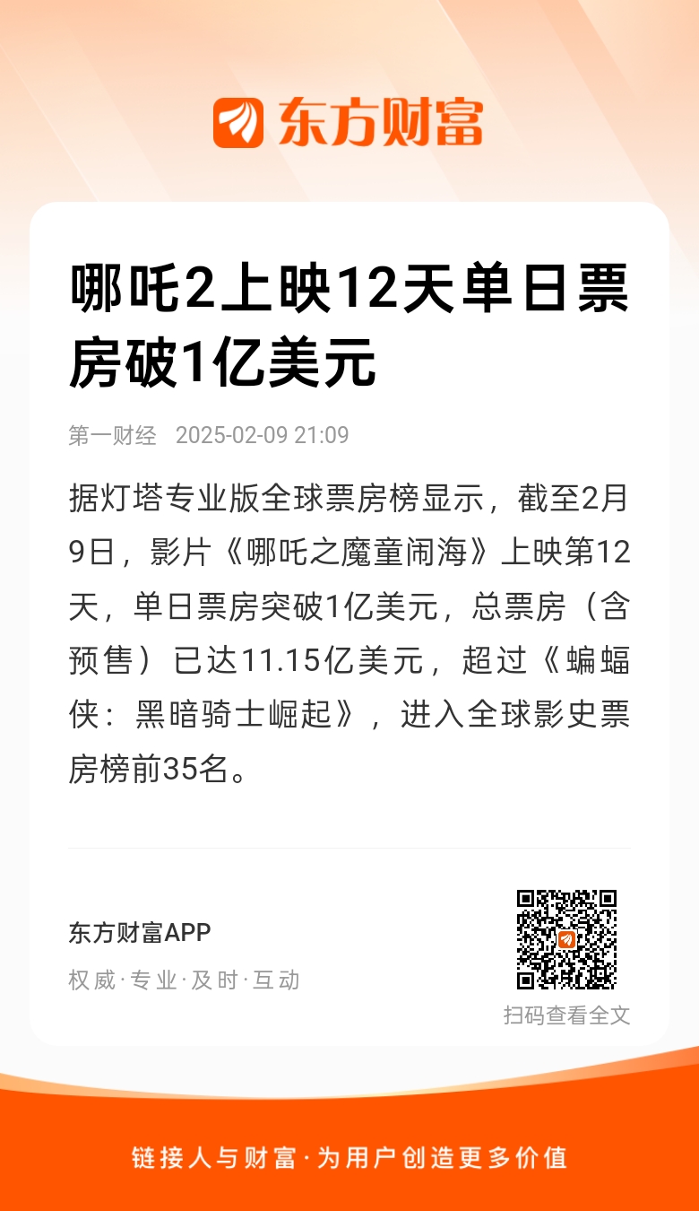 据灯塔专业版全球票房榜显示,截至2月9日,影片《哪吒之魔童闹海》上映第12天,单日票房突破1亿美元,总票房(含预售)已达11.15亿美元,超过《蝙蝠侠:黑暗骑士崛起》,进入全球影史票房榜前35名。