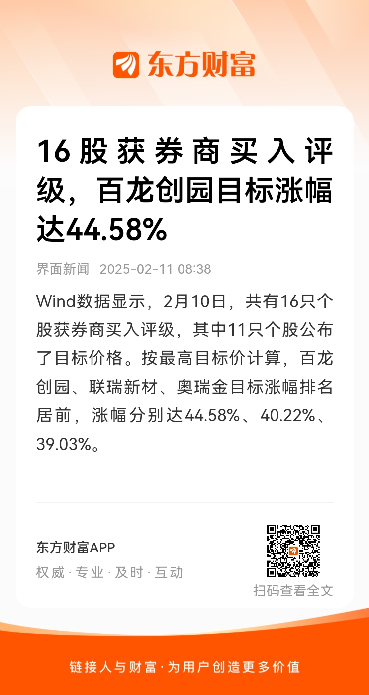 Wind数据显示,2月10日,共有16只个股获券商买入评级,其中11只个股公布了目标价格。按最高目标价计算,百龙创园、联瑞新材、奥瑞金目标涨幅排名居前,涨幅分别达44.58%、40.22%、39.03%。