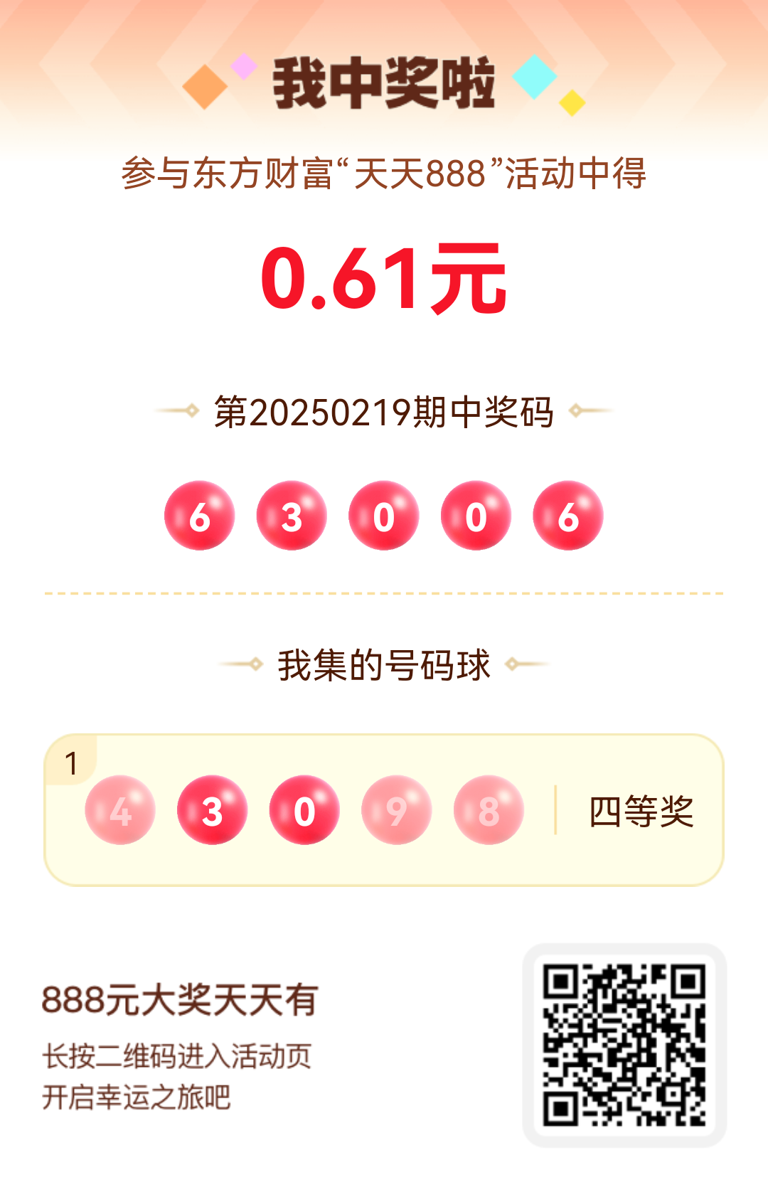 好运来敲门!我在东方财富“天天888”抽奖活动中抽中0.61元红包!快来参与,下一个幸运星可能就是你!