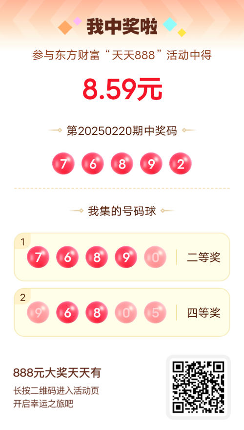 第20250220期天天888活动共1548人中奖,名单如下,请中奖用户在今日15:10前前往活动页面点击【立即领奖】按钮领奖,逾期奖励失效。