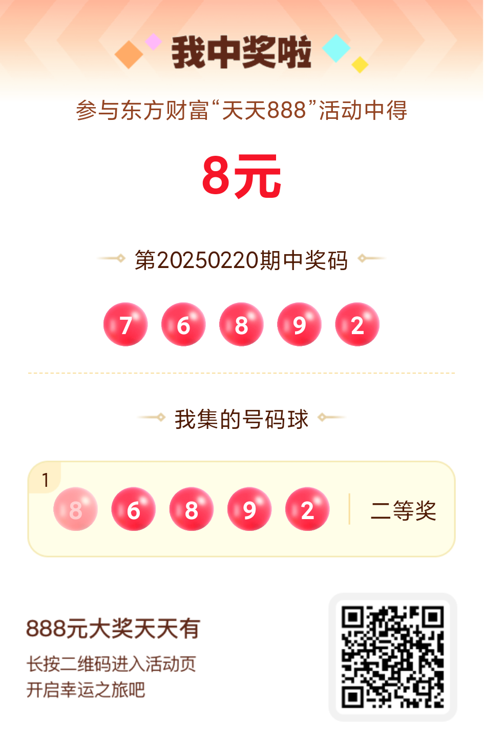 第20250220期天天888活动共1548人中奖,名单如下,请中奖用户在今日15:10前前往活动页面点击【立即领奖】按钮领奖,逾期奖励失效。
