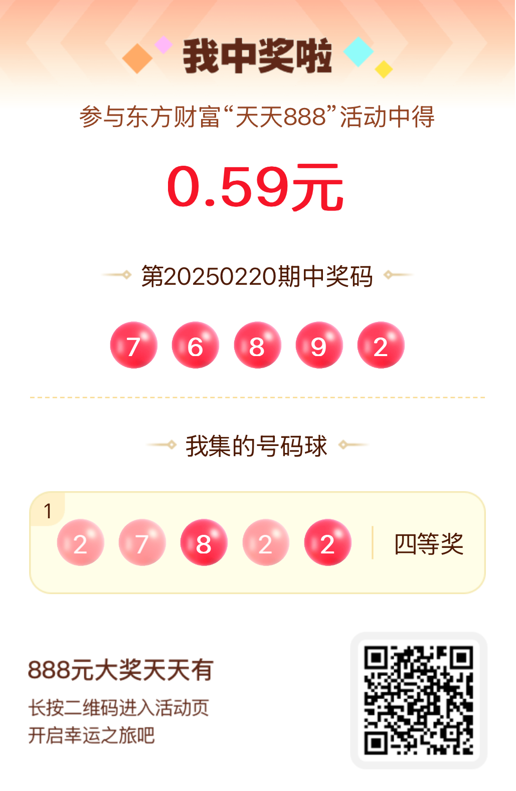 第20250220期天天888活动共1548人中奖,名单如下,请中奖用户在今日15:10前前往活动页面点击【立即领奖】按钮领奖,逾期奖励失效。