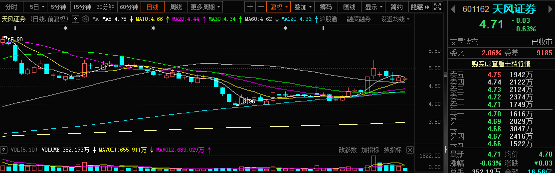 券商的人气龙头,目前是连续两天缩量窄幅震荡,券商就拿住等待就行,没有破底线4.5就等一下轮动,两会市场需要维稳,券商是核心,现在每天接近2万亿的成交,券商也是最受益的。