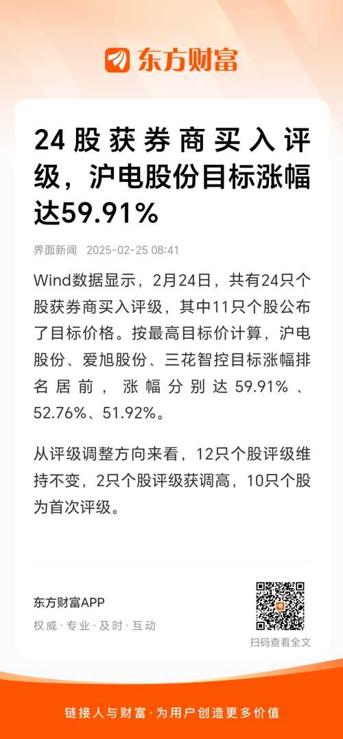 Wind数据显示,2月24日,共有24只个股获券商买入评级,其中11只个股公布了目标价格。按最高目标价计算,沪电股份、爱旭股份、三花智控目标涨幅排名居前,涨幅分别达59.91%、52.76%、51.92%。