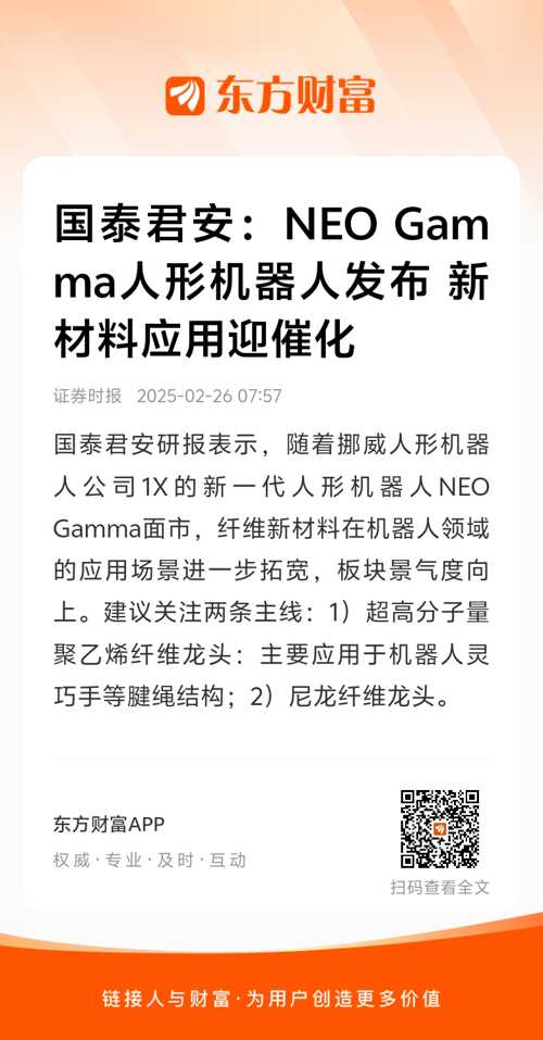 国泰君安研报表示,随着挪威人形机器人公司1X的新一代人形机器人NEO Gamma面市,纤维新材料在机器人领域的应用场景进一步拓宽,板块景气度向上。建议关注两条主线:1)超高分子量聚乙烯纤维龙头:主要应用于机器人灵巧手等腱绳结构;2)尼龙纤维龙头。